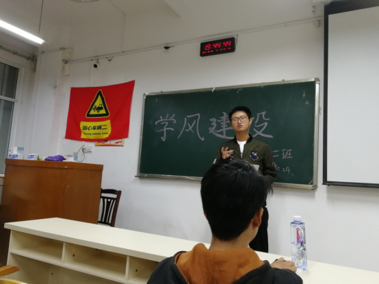 班长发表自己的看法,认为学风重在集体,班内要团结,用我校航V车队的话来说就是人在一起叫聚会,心在一起才叫团队,要有自己的目标,心里清楚自己心中所需,不随波逐流。
