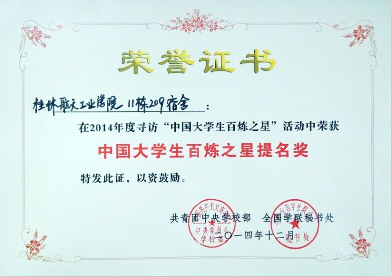 近日,由团中央学校部、全国学联秘书处组织开展的2014年度寻访“中国大学生百炼之星”活动结果揭晓,我系北校区11栋209宿舍 (2014级汽车服务工程专业)荣获2014年度“中国大学生百炼之星”提名奖。 据悉,2014年度寻访“中国大学生百炼之星”活动是为了进一步推进大学生“走下网络、走出宿舍、走向操场”主题群众性课外体育锻炼活动,挖掘“三走”活动的基层榜样,发挥带动作用,形成长效机制,引导大学生积极参加体育锻炼,提升身体素质,体验感受不一样的大学生活,促进大学生健康成长。