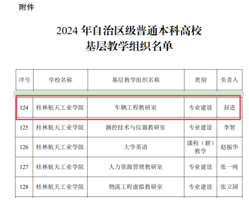 根据《自治区教育厅办公室关于公布2024年自治区级普通本科高校基层教学组织名单的通知》(桂教办〔2024〕941号),FUN乐天使官方网站车辆工程教研室被认定为自治区级普通本科高校基层教学组织。