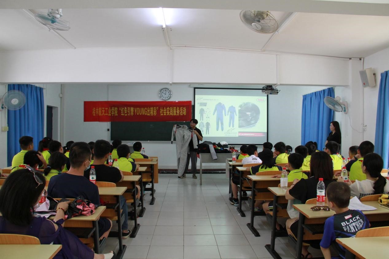 为适应“双减”政策,丰富中小学校的课后服务类型,科普汽车文化知识,点亮孩子们心中的汽车梦,2022年8月7日,桂林航天工业学院“红色引擎 YOUNG出精彩”社会实践服务团队邀请桂林市育才小学的学生来到学校参加活动。