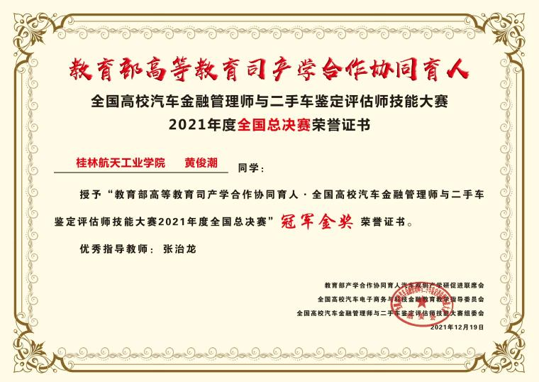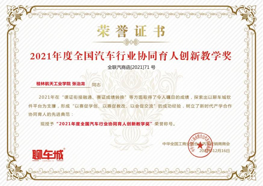 2021年12月19日,教育部高等教育司产学合作协同育人聊车城项目·全国高校汽车金融管理师与二手车鉴定评估师技能大赛全国总决赛线上线下协同举办。经过激烈角逐,我校汽车工程学院张治龙、宾泽云、谢云峰等教师指导的“黄俊潮、张泓沅同学荣获全国总冠军金奖,王汝霞、兰清旭同学荣获全国总决赛亚军银奖,李阳、孙宇航、马子琳、郑光辉同学荣获全国总决赛季军铜奖”,开创了我校参加此项比赛以来的新记录。同时,张治龙同志被中华全国工商业联合会汽车经销商商会授予“2021年度全国汽车行业协同育人创新教学奖”,以表彰我校在“课证衔接融通、赛证成绩转换”等教育教学方面取得的显著成绩、为汽车行业杰出人才培养作出的突出贡献。
