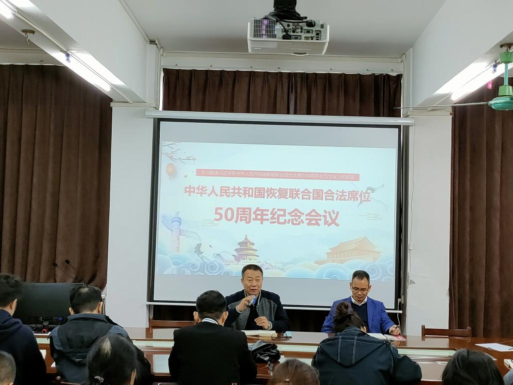 李迪辉为与会教职工解读了新中国恢复在联合国合法席位的重要意义。回顾历史,新中国恢复在联合国合法席位以来的50年,是中国和平发展、造福人类的50年,中国人民以自强不息的精神书写了中国以及人类发展的壮阔史诗;中国人民始终同世界各国人民团结合作;中国人民始终维护联合国权威和地位。展望未来,我们应该大力弘扬和平、发展、公平、正义、民主、自由的全人类共同价值;我们应该携手推动构建人类命运共同体;我们应该坚持互利共赢;我们应该加强合作,共同应对人类面临的各种挑战和全球性问题;我们应该坚决维护联合国权威和地位,共同践行真正的多边主义。