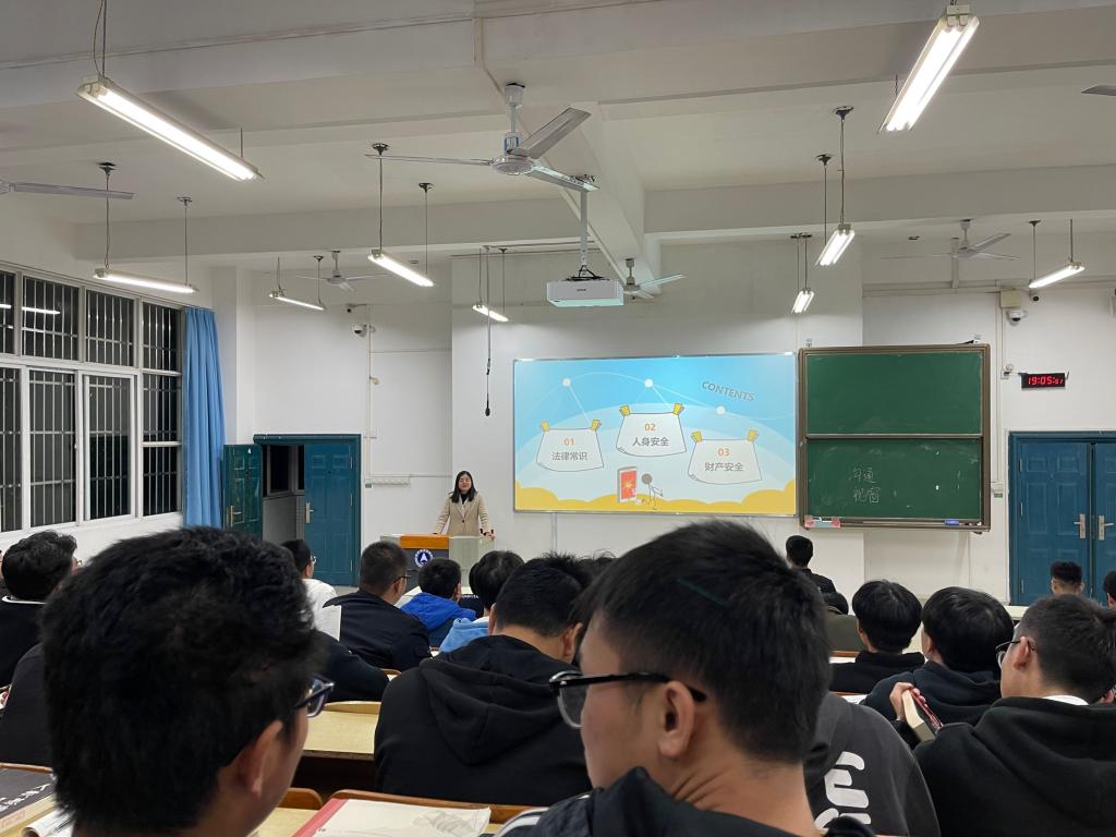 本次安全教育旨在促进学生主动掌握安全防范知识,激发大学生的主观安全意识,不断提高大学生的安全防范意识和避险自救能力,确立正确的安全价值观,培养学生的安全防范能力。安全教育包含了三个方面的内容:一是法律常识,让大学生明白十八周岁以上的公民是成年人,具有完全民事行为能力,要为自己的行为负责,不要触碰法律法规的底线,普及《治安管理处罚法》《刑法》《网络安全法》等法律知识。二是生命至上,要高度重视交通、饮食、校园等人身安全。三是财产安全,尤其要防范网络电信诈骗,并分享了网络贷款诈骗、刷单返利诈骗、冒充电商物流客服诈骗、冒充熟人诈骗、冒充“公检法”诈骗、网络游戏虚假交易诈骗等诈骗方式的作案手法、典型案例和反诈方法。