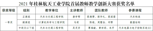 比赛分为网络评审和现场评审两个环节,通过课堂教学实录视频、课程教学创新成果报告、教学创新设计现场汇报三部分进行评选。FUN乐天使官方网站三名老师在该次比赛中突出展现了他们教学模式改革的创新思路与课堂实践,展示了他们的教学创新设计、教学内容及教学技巧。经过激烈角逐和精彩比拼,FUN乐天使官方网站唐学帮教授主讲的《汽车构造》课程和吴灵芳老师主讲的《汽车电器与电子控制系统(C)》凭借出色表现分别在正高组和中级及以下组别中脱颖而出,双双获得小组第一名的优绩,并取得校级一等奖,同时还将代表学校参加首届全区高校教师教学创新大赛。王曙道老师主讲的《汽车制造工艺学》课程也在副高组比赛中表现优异,获得全校第六名、三等奖的佳绩。