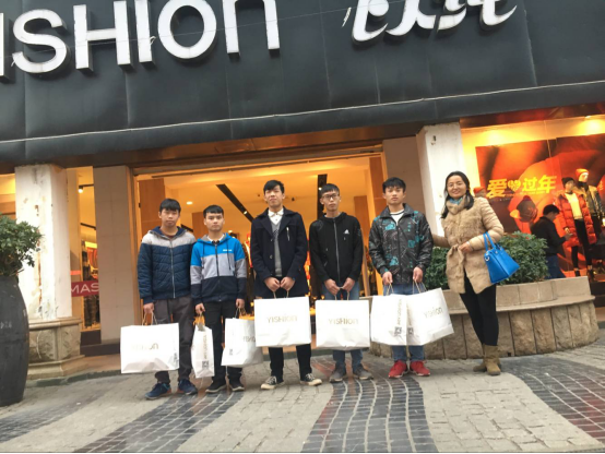 1月12日下午四点前后,辅导员刘敏老师带领这五个同学坐公交车从学校出发,前去市中心的以纯服装店买了衣服,另外两个同学因为有事没有去。经过大半个小时的时间,在以纯服装店,同学们都选到了自己满意的衣服,也帮没来的同学选了两件,大家心里都非常高兴。