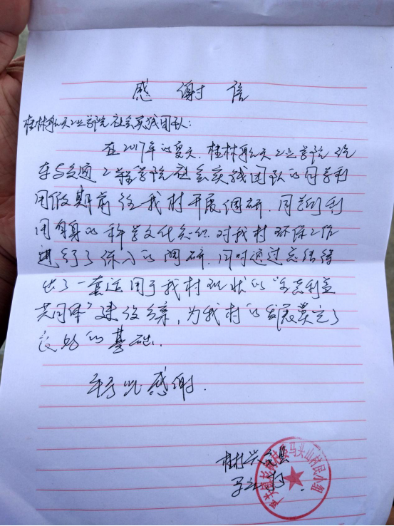 2017年8月27日,项目组成员再次前往马头山村,向马头山村村委提交了旅游开发纲要、生态利益共同体构建要点等多想研究成果,并于马头山村设立了汽车与交通工程学院社会实践基地,马头山村村委为感谢同学们做出的努力,也想同学们递交了感谢信。