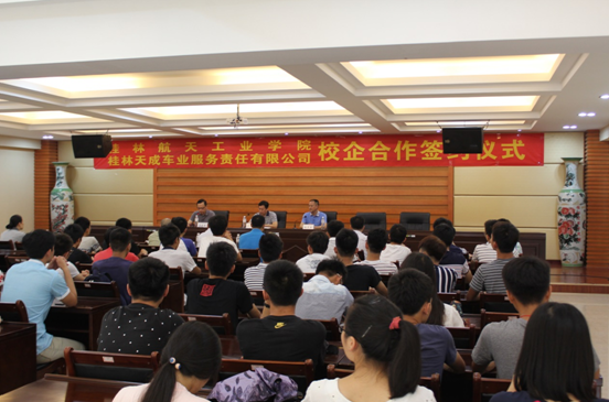 6月24日下午,我校与桂林天成车业服务有限责任公司校企合作签约仪式在飞天楼520会议室举行。我校党委副书记罗延忠,教务处处长苏庆勇,汽车与交通工程学院党总支书记、院长王国富,党总支副书记李迪辉,副院长陈元华;桂林天成车业服务有限责任公司董事长经孝勇,技术总监王金华,市场经理杨丽洲,南溪店总经理史历博,以及师生代表70多人出席签约仪式。