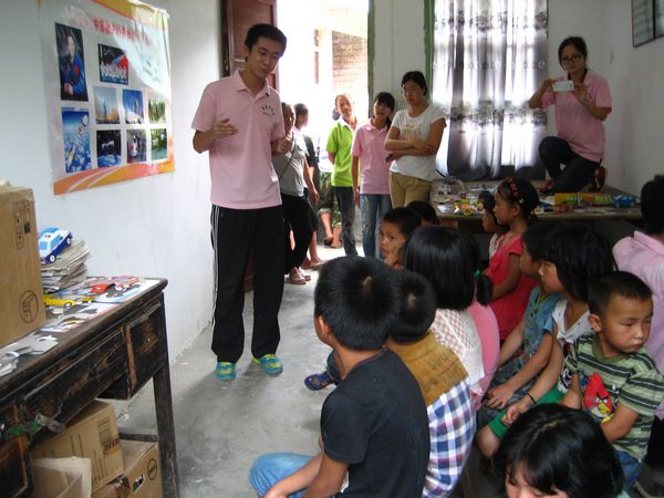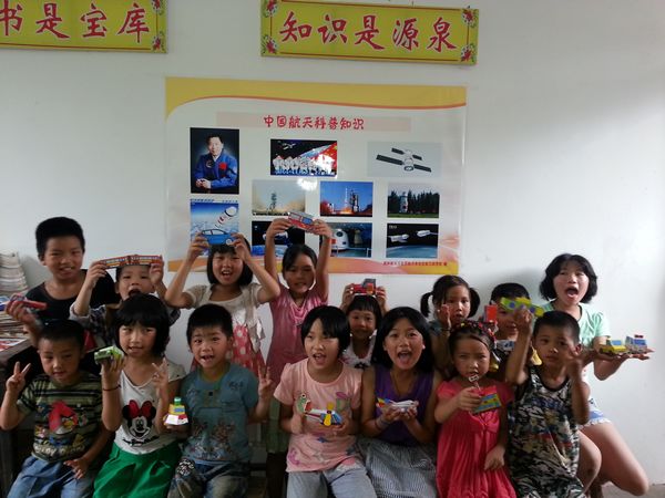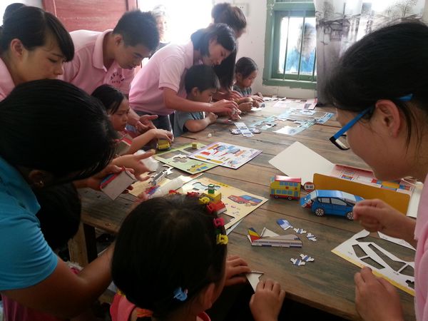团队首先和孩子们以共同做手工的形式开展了初步认识,“你叫什么名字?”“几岁了?”“你的爱好是什么?”“长大后想当什么?”……从一问一答的几句话变成了滔滔不绝的谈心,大手与小手共同编织着对未来的憧憬。孩子们在哥哥姐姐的指导下,制作了喜爱的小动物、小玩具,一起琢磨着只能在电视上见到的飞机、火车、汽车模型,很快与小朋友们打成了一片,欢声笑语充满了整个小课堂。在窗外一旁的村民们也忍不住来到孩子的身旁,一同做起了手工。一位村民感叹:“这是第一次陪孩子共同完成这样有趣的“小任务”,激动、高兴!”