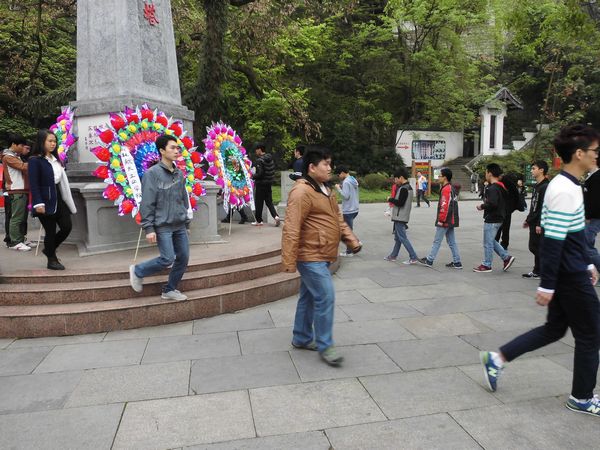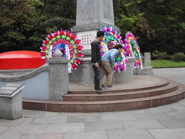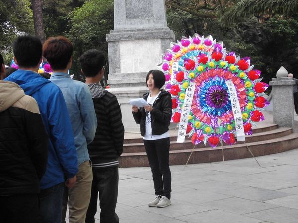 活动在庄严肃穆的气氛中举行,学生党员代表周燕燕同学首先向同学们讲述了陈光烈士的英雄事迹,团员代表尹陶等同学纷纷就烈士精神发表感言,对“五星红旗是革命先烈们的鲜血染红”这句话有了更深入的认识,对“幸福生活来之不易”有了更深刻的体会。两名学生代表向烈士墓碑敬献了花圈,全体同学默默地围绕墓碑献上了手中的小白花,并全体默哀三分钟,向烈士的英魂致以深深的缅怀和无限的追忆。默哀完毕,党团员青年们整齐地向烈士墓碑三鞠躬,向先烈致以最崇高的敬意。随后,在烈士纪念碑前,党团员青年们对党旗和团旗重温入党、入团誓词,誓词在纪念碑前久久回荡,大家嘹亮而坚定的声音表达了对英勇伟大的革命先烈的敬佩。