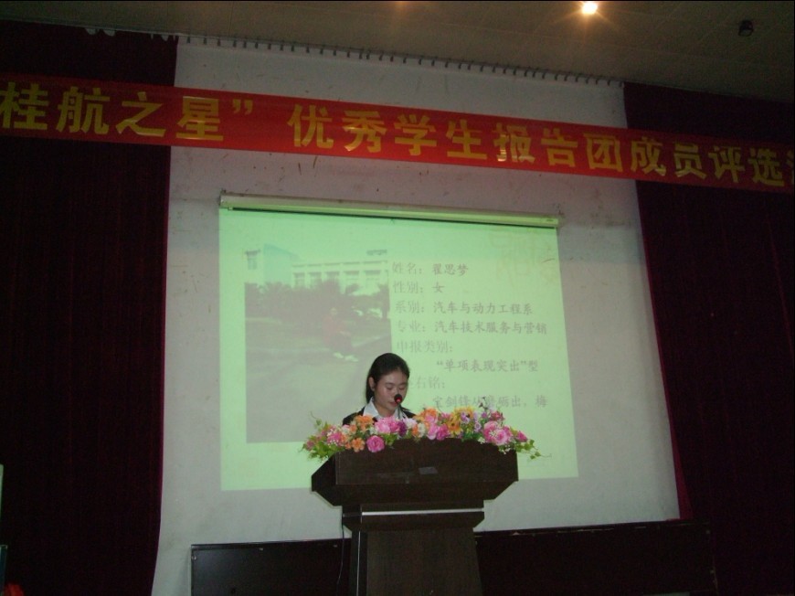 2012年12月6日在电教馆举行了桂林航天工业学院首届“桂航之星”优秀学生报告团成员评选活动。我系翟思梦同学作为代表参加了此次活动。