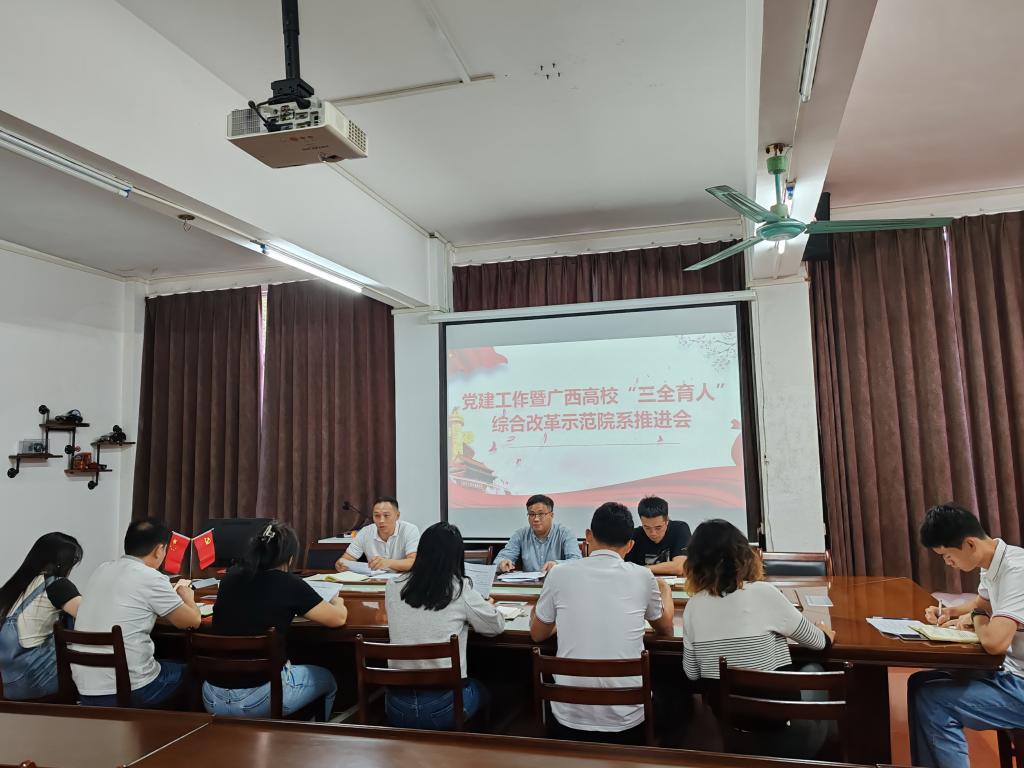 为全面推进学院党建工作和广西高校“三全育人”综合改革示范院系建设工作,11月3日,学院召开党建工作暨“三全育人”工作推进会,学院党委委员、院长助理、各党支部书记、组织员参加会议,会议由学院党委副书记李中焘主持。
