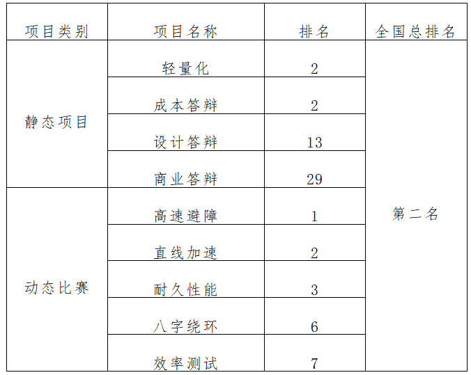在为期六天的比赛里,我校航V车队的赛车通过了电池检查、机械检测、淋雨测试等六项严柯的车检项目,检查细则高达200余条,参赛队员阐述了赛车设计和成本控制方案,展示了商务营销前景,沉着冷静地完成了动态项目。最终获得高速避障第一名、直线加速第二名、成本分析第二名、轻量化设计第二名、耐久测试第三名五个单项奖,以总分784.79分位列总成绩全国亚军。