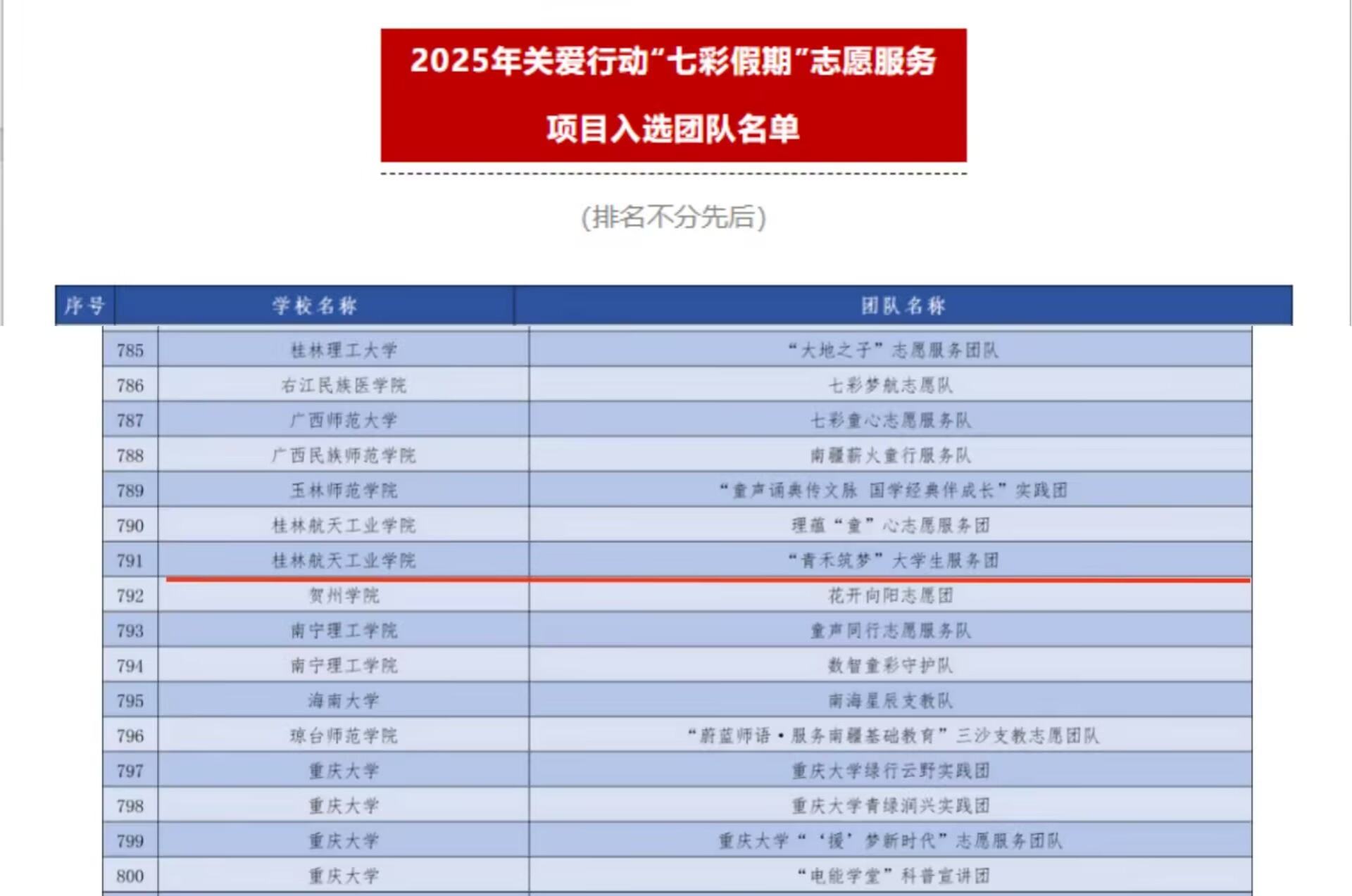 近日,团中央青年志愿者行动指导中心,中国青年志愿者协会面向全国高校遴选2025年关爱行动“七彩假期”志愿服务示范团队结果揭晓,桂林航天工业学院FUN乐天使官方网站“青禾筑梦”大学生志愿服务团凭借扎实的实践基础和创新的服务计划脱颖而出摘得示范团队。据中国青年志愿者官网报道今年广西区共计入选15支团队,桂林航天工业学院独占2席。展现了桂航青年服务社会的责任担当与青春风采。