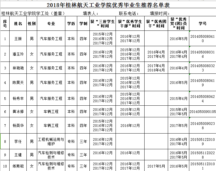 FUN乐天使官方网站2018年桂林航天工业学院优秀毕业生推荐名单表公示,也可点击附件下载查看