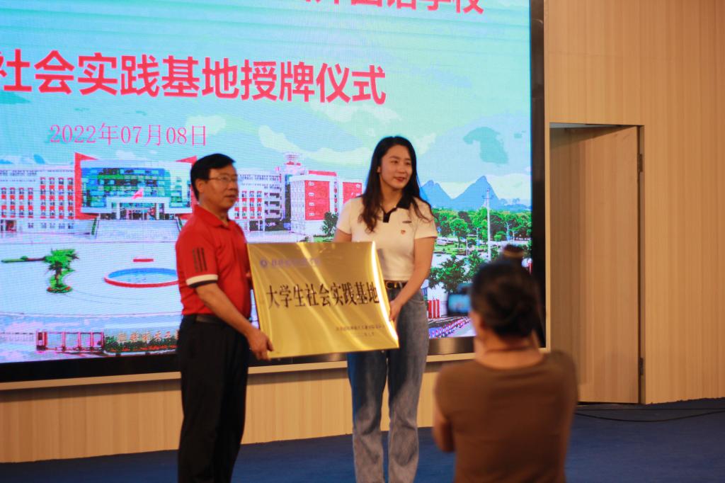 图为桂林高铁园外国语学校刘新来校长接收“桂林航天工业学院大学生社会实践基地”授牌