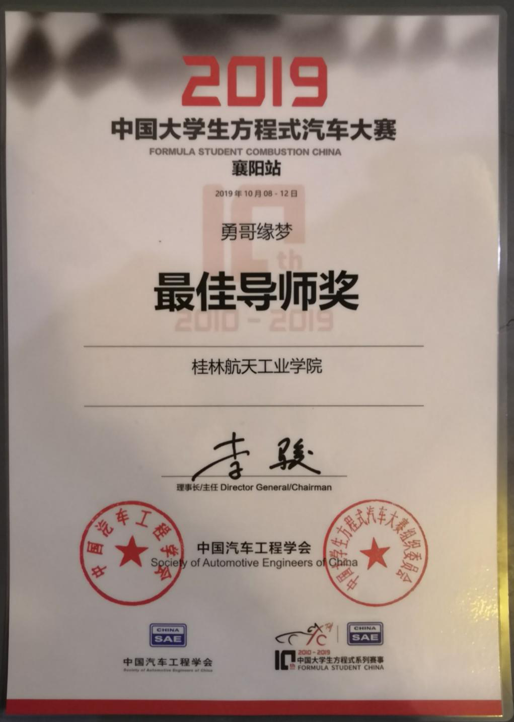 10月12日,在湖北襄阳,由中国汽车工程学会主办的2019中国大学生方程式汽车大赛在湖北襄阳梦想方程式赛车场落下帷幕。来自全国60余所高校的方程式赛车队和社会各界人事共2000余人共同见证了本次大赛的举办。我院航V车队连需5年参加该赛事。
