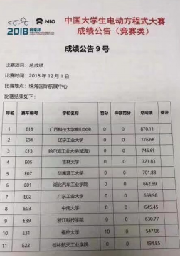 2018“蔚来杯”中国大学生电动方程式大赛,于12月1号广东珠海国际航展中心圆满落幕。从11月27日开始,经过五天激烈的角逐,桂航易车航V电车队在首次参加的“蔚来杯”中国大学生电动方程式大赛中,以总成绩第11名,获得全国二等奖。