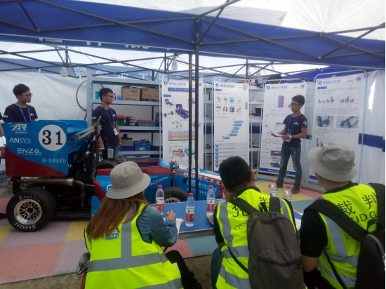 设计报告与成本报告进行中。设置赛车设计报告的目的在于评估各队在设计赛车时在工程层面作出的努力以及从车辆性能和综合价值考虑其工程设计是否符合市场需求。设置成本报告的目的在于培养在发挥赛车每个零部件及总成的性能优势的基础上在满意度和成本间进行平衡的能力。参与设计报告的队员与裁判阐述了设计理念和设计亮点,同时,裁判也给出了改进的建议,让我们有所启发。在成本报告上,我们队员详细地讲解了我们的思路,裁判给了我们宝贵的意见,让我们有所改进。