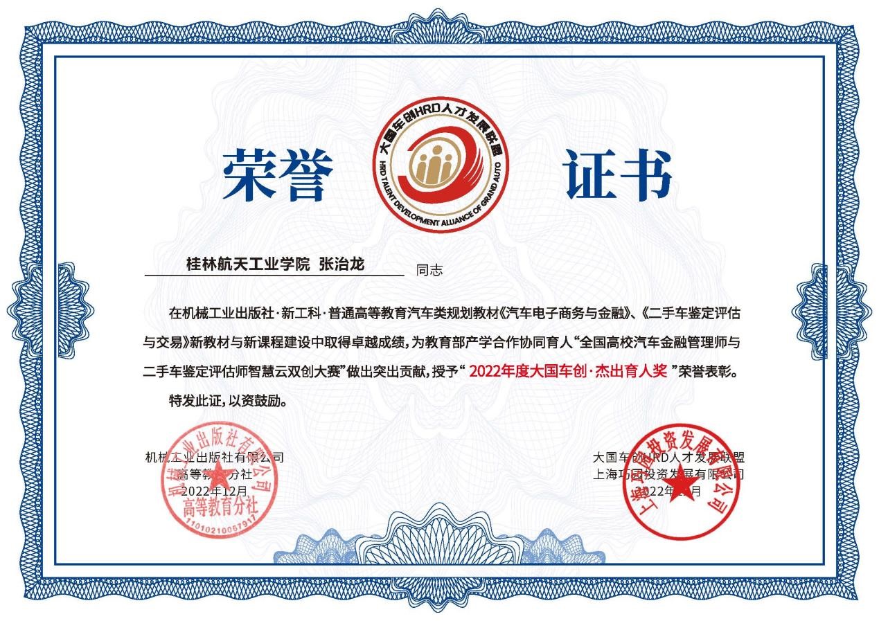 12月17日,中国汽车卓越拔尖人才发展大会暨机械工业出版社“2022年度大国车创·杰出育人奖”高校教师表彰大会隆重召开,本届大会在教育部产学合作协同育人巧园汽车双创产学研促进联席会、教育部供需对接就业育人聊车城名企优岗专委会、机械工业出版社、全国高校汽车电子商务与科技金融教育教学指导委员会等指导下,并由上海巧园投资发展有限公司、聊车城(上海)新能源发展有限公司共同承办,桂林航天工业学院教师张治龙与全国52名高校领导、教师及汽车产业专家学者参会,共谋产教融合新发展。