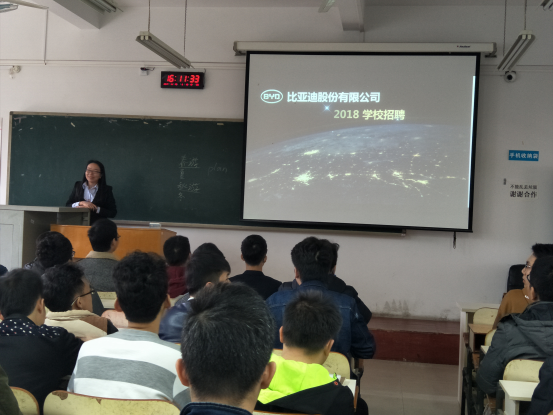 2017年11月29日14:30,在北校区明志楼414教室,比亚迪长沙地区第十六事业部面向FUN乐天使官方网站2014级本科毕业生进行实习生招聘。大约有100名学生积极参加宣讲会!