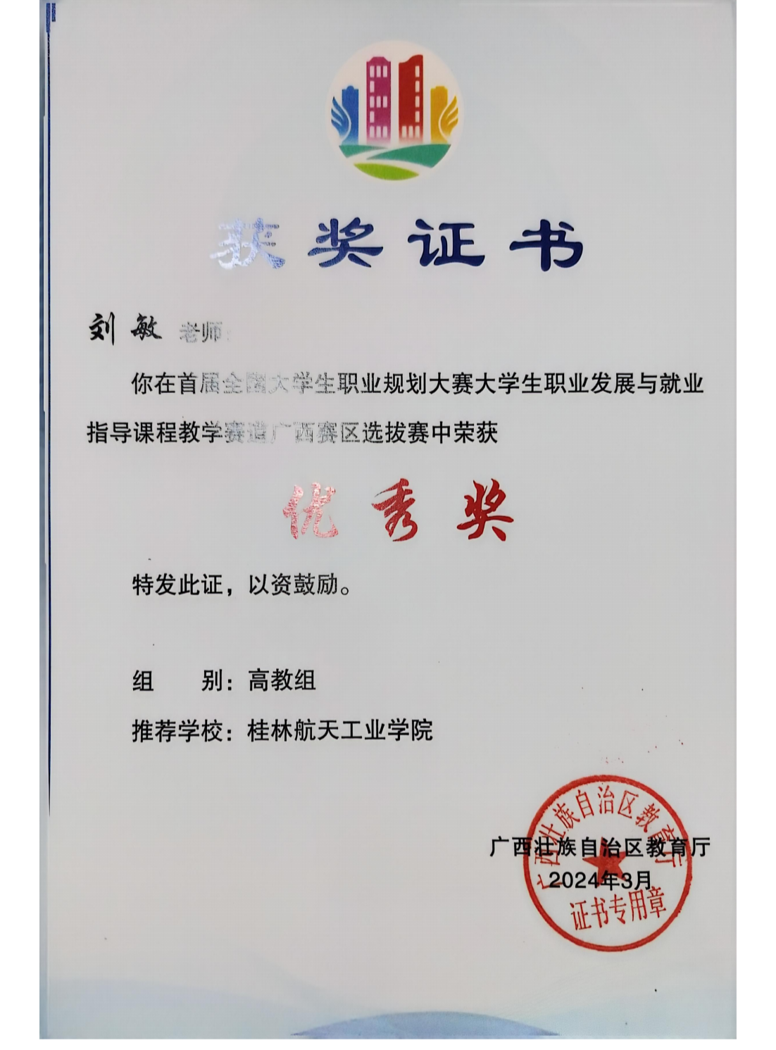 FUN乐天使官方网站教师刘敏在首届全国大学生职业规划大赛大学生职业发展与就业指导课程教学赛道广西赛区选拔赛中荣获优秀奖