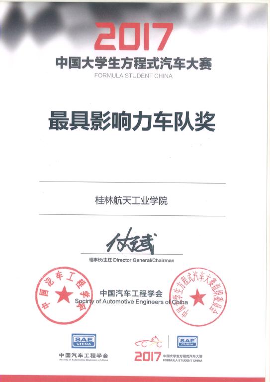 桂林航天工业学院航V车队油车队荣获2017中国大学生方程式大赛最具影响力车队奖